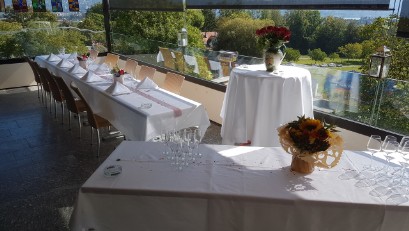 Auf Wunsch und je nach Anlass - zum Beispiel für eine Hochzeit - decken wir auch gerne mal in Weiss ein und stellen rote Rosen auf die Tische.
